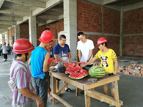烈日炎炎送清涼,情意暖暖感人心。7月26日上午,營(yíng)山分公司副經(jīng)理金杰帶領(lǐng)辦公室相關(guān)工作人員代表營(yíng)山分公司來到營(yíng)山縣樞紐站建設(shè)工地看望慰問一線工人,給在項(xiàng)目工地一線施工的工人們送去了風(fēng)油精、藿香正氣水、夏桑菊等防暑藥品,還有甘甜可口的大西瓜。金副經(jīng)理為項(xiàng)目管理人員和施工人員講解了防暑注意事項(xiàng),要求項(xiàng)目部一定要做好員工勞動(dòng)保護(hù)和安全文明施工工作。同時(shí),對(duì)工人們?yōu)榻ㄔO(shè)項(xiàng)目工程所付出的辛勤勞動(dòng)和做出的貢獻(xiàn)表示衷心感謝,提出“把有利健康、保證安全放在第一位”,并且叮囑相關(guān)負(fù)責(zé)人,高溫酷暑期間,要合理安排工作時(shí)間。此次“送清涼”活動(dòng)極大的鼓舞了戰(zhàn)斗在一線的施工人員的士氣,同時(shí)為項(xiàng)目建設(shè)安全生產(chǎn)提供了有效的保障。工人們表示不管天氣多么炎熱,也要克服困難按期完成施工任務(wù)。 (陳弘 何芳)