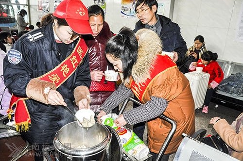 匡紅艷愛(ài)心班的“小紅帽”,為旅客送“愛(ài)心餃子”。