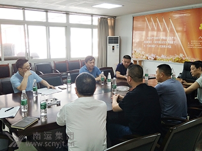 省運(yùn)管局副局長張洪(左二)聽取儀隴分公司經(jīng)理林勁松關(guān)于汛期安全生產(chǎn)工作落實(shí)情況的匯報(bào)。