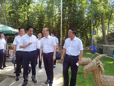 南充市政協(xié)副主席、閬中市委書記張斌(右三),浙江天臺縣委書記管文新(右二)考察調(diào)研楊家河景區(qū)旅游扶貧工作。