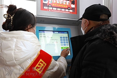 志愿者引導(dǎo)七十歲大爺在自動售(取)票機(jī)上購票