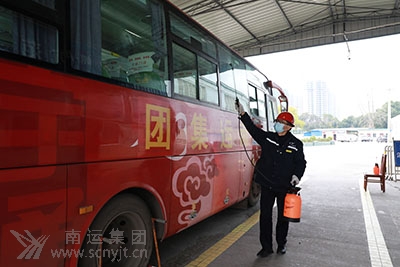 站務(wù)人員為返程客車消毒