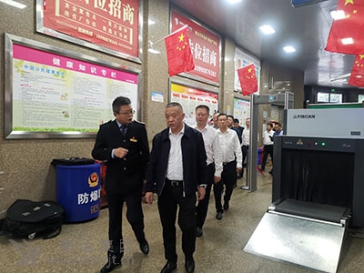 市委常委、政法委書記陳有波(左二)在南充市城北汽車客運站檢查中秋國慶安全生產(chǎn)