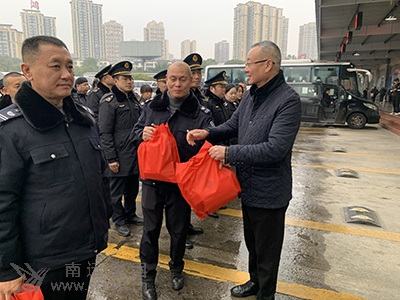 南充市交通運輸局一級調研員張世民向駕駛員贈送春運禮包