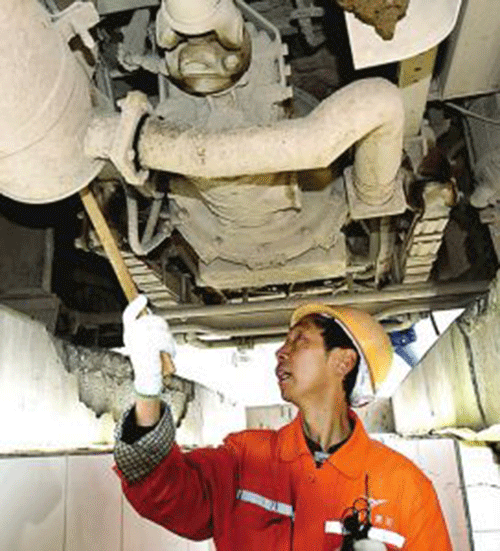 “客車必檢的8個部位,個個都非常重要。”任科榮告訴記者:“山區(qū)行車時,轉(zhuǎn)向節(jié)方向垂臂背上的螺釘容易松動。螺釘一松,螺栓容易脫落,方向垂臂和方向盤呈脫離狀態(tài),司機不能控制客車,后果不堪設(shè)想。”為了不耽誤第二天早班車發(fā)車,例檢員要提前一天把第二天7點以前發(fā)班的客運車輛全部檢查一遍,給存在安全隱患的客運車輛留出更多修車時間,防止延誤第二天發(fā)車,影響旅客出行。