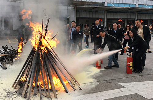 員工參加了現(xiàn)場應(yīng)急消防演練的情景