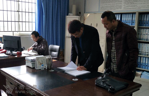 省運管局檢查組組長胡濤(中)查閱高速客運分公司有關(guān)安全資料