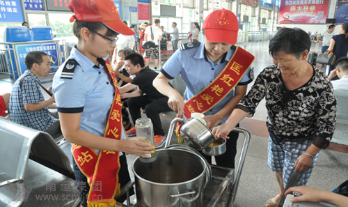 盛夏時(shí)節(jié),恰值每年暑運(yùn)高峰,在南充汽車客運(yùn)站內(nèi),數(shù)千旅客川流不息,奔波于各自的行程中。為做好旅客乘候車過程中站務(wù)服務(wù)工作,南充汽車客運(yùn)站組織“匡紅艷愛心班”自愿者服務(wù)隊(duì)員,利用業(yè)余時(shí)間熬煮綠豆南瓜湯,堅(jiān)持每天送到候車大廳、售票大廳,送到每一位需要的旅客手中。她們用愛心為候車的旅客送上了一絲絲清涼,一些旅客見此情景深受感動(dòng),一位趕乘蓬溪班車的旅客在連續(xù)喝了三杯后感慨地說到“沒想到你們做得這么好,在其他地方我真還沒有見到過”。并問道“你們是每天都送綠豆湯嗎”?愛心班的姐妹們回答到:“在夏日伏天中我們每天都要給旅客送到現(xiàn)場,歡迎你下次來站飲用”。這位旅客連聲稱贊地說“謝謝你們,有時(shí)間我一定在網(wǎng)上宣傳你們”!安挥茫灰銈儩M意就是對(duì)我們最好的肯定”。為旅客在候車的時(shí)候解除暑熱,帶來涼意,是愛心班姐妹們的心愿。當(dāng)志愿者們看到旅客喝著綠豆湯,倦意漸消的情景,她們倍感欣慰。她們知道在這“火熱”的盛夏里,送綠豆湯的小小舉動(dòng),溫暖了旅客們的心。 (張蜀慧 王洪)