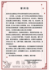 尊敬的市交通運(yùn)輸局黨委: 在投入鄰水緊張的抗疫工作間隙,我們南運(yùn)集團(tuán)奔赴鄰水抗疫一線的22名黨員先鋒隊(duì)駕駛員及領(lǐng)隊(duì),懷著激動(dòng)地心情傳達(dá)閱讀了市交通運(yùn)輸局黨委給我們發(fā)的既熱情洋溢鼓舞斗志,又充滿溫暖深情牽掛的《慰問(wèn)信》,讓我們勇氣倍增,更加堅(jiān)定了圓滿完成支援鄰水防疫任務(wù)的信心和決心,在此謹(jǐn)代表南運(yùn)集團(tuán)出征鄰水的全體黨員先鋒隊(duì)駕駛員及領(lǐng)隊(duì)向局黨委的親切關(guān)懷和暖心慰問(wèn)表示衷心感謝! 請(qǐng)局黨委放心,我們?cè)卩徦挂咭痪,一定不忘初心,牢記使命,只爭(zhēng)朝夕,不負(fù)韶華,聽(tīng)從當(dāng)?shù)刂笓],服從工作安排,遵守防疫紀(jì)律,落實(shí)防控要求,加強(qiáng)個(gè)人防護(hù),確保自身安全,充分展現(xiàn)南充交通人的大愛(ài)情懷,上下一心,眾志成城,全力以赴打贏疫情防控殲滅戰(zhàn)!為鄰水防疫工作做出應(yīng)有貢獻(xiàn)! 上下同欲者勝,風(fēng)雨同舟者興。請(qǐng)局黨委相信:在市委市政府的正確領(lǐng)導(dǎo)下,在市局黨委的堅(jiān)定支持下,我們絕不辜負(fù)市局黨委和南充人民的信任重托和殷切希望!堅(jiān)決確保圓滿完成上級(jí)黨組織交給我們的抗疫運(yùn)輸保障光榮任務(wù)!為南充人民爭(zhēng)光!為南充交通爭(zhēng)光! 此致敬禮! 南運(yùn)集團(tuán)赴鄰水抗疫一線黨員先鋒隊(duì)全體駕駛員 2022年5月18日晚十一時(shí)