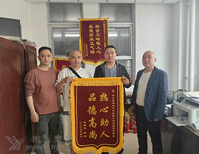 患者乘客張國民(左二)給營山鴻運(yùn)的哥肖建俠(右二)贈(zèng)送大紅錦旗以表謝意。