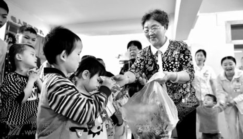 5月26日下午,南運(yùn)集團(tuán)“愛心婆婆”葉千秀帶著禮物,來到市兒童福利院,提前陪孩子們過“六一”。今年,是葉婆婆陪孩子們過的第十個兒童節(jié)。 “葉婆婆,謝謝你來看我們!笨吹饺~千秀,孩子們高興不已,圍在葉千秀的身邊,親切地向她問好!皝,孩子們,這是我給你們的節(jié)日禮物,祝你們節(jié)日快樂。”葉千秀拿出餅干、糖果,一 一分發(fā)給孩子們。隨后,葉千秀又拿出2000元現(xiàn)金,交給福利院工作人員,叮囑工作人員給孩子們買點(diǎn)他們喜歡的玩具。 葉千秀是南運(yùn)集團(tuán)一名普通的退休老人,她先后幫助26名大學(xué)生完成學(xué)業(yè),還資助了1名高中生,兩名初中生。兒童康復(fù)中心的孩子需要幫助,她慷慨解囊;老年合唱團(tuán)沒活動經(jīng)費(fèi),她伸出捐助之手。從2007年開始,她每年都會到兒童福利院陪孩子們過節(jié)。16年來,她已捐出58萬元現(xiàn)金。 (摘自2016年5月27日《南充日報》第六版 記者 陸待君)