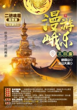 第一天:當?shù)?成都 宿:成都市區(qū)指定酒店 第二天:成都—峨眉山 宿:峨眉山半山 06:30成都三環(huán)內(nèi)接(到酒店接站時間預計提前1小時左右),07:30在成都市武侯區(qū)高朋東路附近集合出發(fā),上車后繼續(xù)小睡,經(jīng)過 2 小時30分后抵達佛國仙山峨眉山。 (溫馨提示:旺季因旅游人數(shù)較多,為避免您到達景區(qū)后耗時排隊過長,可能會提前出發(fā),請配合導游工作;具體集合時間和地點以導游通知為準。 11:30萬年寺停車場午餐品嘗【地道峨樂小吃宴】以樂山峨眉山當?shù)卣诿〕詾橹鞯牟,包含西壩豆腐、甜皮鴨等?jīng)典特色美食 ,贈送嘉州豆腐腦+仙山凍粑。 后搭乘景區(qū)環(huán)保觀光車(觀光車費自理90/人)上山,前往雷洞坪。 13:30到達雷洞坪停車場,步行1.5公里到【接引殿】(途中會路過一個野生猴區(qū)分布地,可觀賞野生猴子,請注意在觀賞時不要靠太近,喂食等),乘索道【索道費用自理65/人】上【金頂】,朝拜【十方普賢圣像】,參觀金頂【華藏寺】和 “銀殿”【臥云庵】,天氣晴好時還可遙望遠方的貢嘎峰;游覽【金剛嘴】【舍身崖】等景點,運氣好時有幸遇到佛光。游完金頂后乘下行索道【索道費用自理55/人】按原路返回雷洞坪停車場。 16:30乘景區(qū)觀光車下山前往半山,入住酒店。 18:00品嘗當?shù)仞B(yǎng)生餐-【久養(yǎng).峨眉藥膳養(yǎng)生宴】,觀看匯集全川的民間藝術(shù)精品,彝族舞蹈,皮筋,吐火,魔術(shù),舞蹈乖幺妹兒,讓此次旅行有顏有味。溫馨提示如果因特殊原因排隊堵車等等下山晚,表演取消,贈送項目無費用退。 峨眉山野生中藥材+生態(tài)跑山雞耗費5小時精心熬制鍋底。主菜:年份生態(tài)雞一只2.5斤、晶髈蹄名(肘子500g)、養(yǎng)生肉丸(10個)、精品五花肉(250g)、峨眉香酥(250g)、美好火腿(250g)、鵪鶉蛋1份、山藥1份、冬瓜1份、米粉1份、竹筍1份、泉水豆腐1份、青菜葉子2份、竹蓀1份、時素拼盤1份、面條1份、水果拼盤1份。 第三天: 峨眉山—樂山大佛—成都-當?shù)?/span> 06:30在酒店用早餐(或路早),辦理退房手續(xù)。 07:00餐后乘索道【索道費用自理65/人】上行至萬年索道站,步行至普賢菩薩道場---萬年寺,游覽被喻為“白水秋風”的【萬年寺】【萬年寺門票自理10元/人】,在寺內(nèi)參觀峨眉山鎮(zhèn)山之寶重達62噸的【普賢神像】,下行至白娘子修道成仙的【白龍洞】、【清音閣】、【清音平湖】、【黑龍江棧道】、【一線天】、【自然生態(tài)猴區(qū)】,后按原路返回到清音閣,然后至五顯崗。{黑龍江棧道、一線天、自然生態(tài)猴區(qū)因地理位置特殊屬于游客自行前往,導游不陪同,且此段行程視時間而定,如時間來不及可能放棄游覽} (溫馨提示:節(jié)假日或旅游旺季因旅游人數(shù)較多,為避免您到達景區(qū)后耗時排隊過長,可能會提前出發(fā),請配合導游工作;具體時間以導游通知為準) 12:30午餐安排品嘗當?shù)靥厣恕?/span> 14:30餐后乘車前往樂山。 前往樂山大佛景區(qū),登山觀看大彌勒坐佛—樂山大佛,樂山大佛修建于唐朝通高71米,親身體會“山是一尊佛,佛是一座山”的雄偉壯觀。溫馨提示:門票景區(qū)打包價 樂山免票退30元/人;1.16-12.14峨眉山免票退50元/人,半票退20元;12.15-次年1.15峨眉山免票退30元/人;樂山退30元/人,半票不退。 16:30乘旅游大巴車返回成都,回程會與其他團隊一起回成都,一人一座。預計18:30左右返回成都。 18:30左右到成都市武侯區(qū)高朋東路地鐵口附近統(tǒng)一散團,后乘車返回當?shù)兀ㄜ囐M已含)結(jié)束愉快美好的旅程。 溫馨提示: 用車:空調(diào)旅游車,確保一人一座;可提前升級保姆車。 門票:樂山大佛、峨眉山首道大門票,產(chǎn)生優(yōu)惠免票按旅行社景區(qū)協(xié)議價退款。 用餐:含1早3正(正餐10人一桌,不含酒水;菜品根據(jù)人數(shù)和季節(jié)會有所調(diào)整;不用餐不退費用) 酒店:峨眉山半山1晚住宿(參考酒店:凱優(yōu)威爾晚香樓/仙蹤林、迎客軒酒店,嘉友酒店、圣象大酒店、東輝大酒店、華英酒店、飛音閣酒店等)若產(chǎn)生單男單女或自然單間,我社有權(quán)安排三人間或客人自付單房差。 導游:全程一個導游服務(wù),不換導游。 保險:旅游意外保險服務(wù)(不含景區(qū)猴區(qū)及索道保險,需要請在景區(qū)自購)。 咨詢報名熱線:0817-2247888 小李15984840777 小顧15882684881 小程15351260777 (高速客運分公司 朱玲)